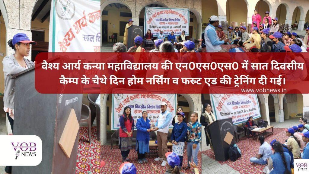 वॉइस ऑफ़ बहादुरगढ़ न्यूज़ 11 फरवरी 2023 को शहर के वैश्य आर्य कन्या महाविद्यालय की एन0एस0एस0 इकाई द्वारा ग्राम परनाला में सात दिवसीय कैम्प के चैथे दिन प्रातः कालीन सत्र में छात्राओं को होम नर्सिंग व फस्र्ट एड की ट्रेनिंग दी गई।