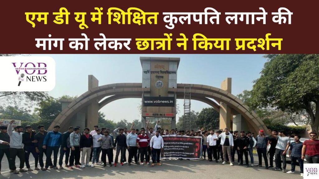 वॉइस ऑफ़ बहादुरगढ़ न्यूज़ रोहतक संजय पांचाल रोहतक, महर्षि दयानन्द विश्वविद्यालय रोहतक में शिक्षित कुलपति लगाने की मांग उठने लगी है। शिक्षित कुलपति लगाने की मांग को लेकर एम.डी.यू. के छात्रों ने इनसो के नेतृत्व में प्रदर्शन किया। प्रदर्शनकारी छात्रों ने बैनर लेकर मुख्यमंत्री मनोहर लाल से तीन सवाल भी पूछे शनिवार करीब 11 बजे काफी संख्या में एम.डी. यू. के छात्र गेट न 2 पर एकत्रित हुए। उन्होंने हाथों में बैनर ले रखा था जिस पर मुख्यमंत्री से सवाल पूछ रखे थे।