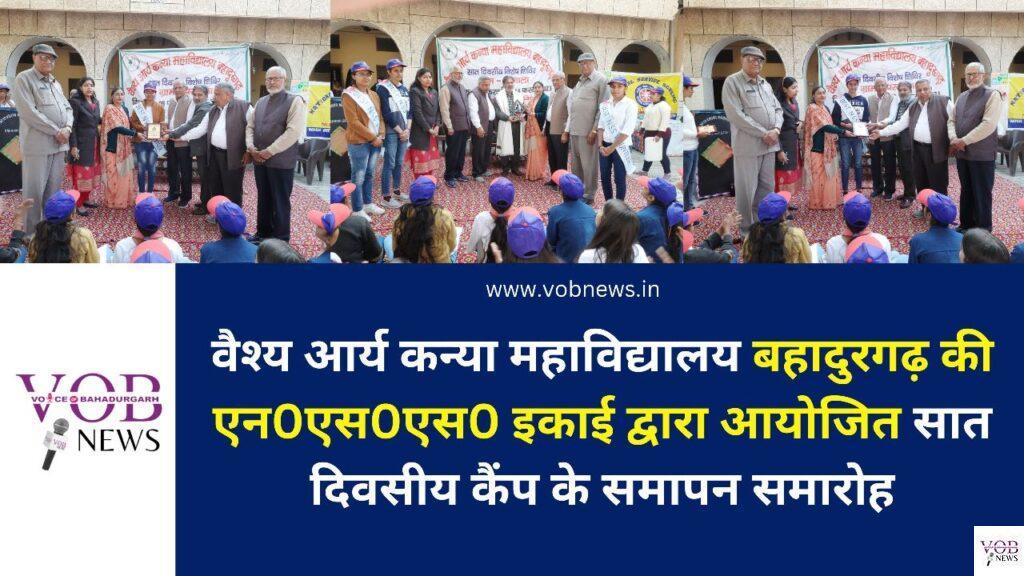 वॉइस ऑफ़ बहादुरगढ़ न्यूज़ 14 फरवरी 2023 को शहर के वैश्य आर्य कन्या महाविद्यालय बहादुरगढ़ की एन0एस0एस0 इकाई द्वारा आयोजित सात दिवसीय कैंप के *समापन समारोह* में स्वयं सेविकाओं को प्रमाण पत्र व पैन भेंट कर प्रोत्साहित किया गया। कार्यक्रम में मुख्य अतिथि के रुप में प्रोफेसर राजकुमार एन0एस0एस0 कोऑर्डिनेटर एम0डी0यू0 रोहतक ने शिरकत की। गेस्ट ऑफ ऑनर के रूप में परनाला गांव की सरपंच श्रीमती मुकेश राठी ने शिरकत की। कार्यक्रम की अध्यक्षता बहादुरगढ़ शिक्षा सभा के प्रधान श्री श्रीनिवास गुप्ता ने की।