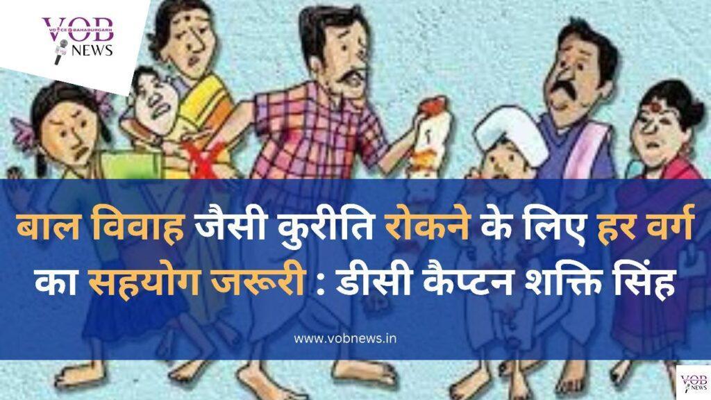 वॉइस ऑफ़ बहादुरगढ़ न्यूज़ झज्जर, 16 फरवरी। डीसी कैप्टन शक्ति सिंह ने कहा कि जिलाभर में महिला एवं बाल विकास विभाग व जिला बाल संरक्षण विभाग द्वारा शादियों के सीजन में बाल विवाह पर रोक लगाने के उद्देश्य से महिलाओं को जागरूक किया जा रहा है। वहीं सरकार और प्रशासन के साथ- साथ समाज के हर वर्ग को भी सहयोग जरूरी है,ताकि बाल विवाह जैसी समाजिक कुरीतियो को रोका जा सके।