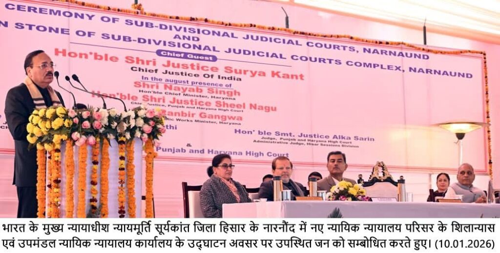 भारत के सुप्रीम कोर्ट के माननीय मुख्य न्यायाधीश न्यायमूर्ति सूर्यकांत ने कहा कि हांसी में शीघ्र ही सेशन डिवीजन स्थापित की जाएगी। हांसी को प्रदेश का 23वां जिला बनाने के बाद यहां हांसी वासियों के लिए एक और सुविधा होगी। आमजन को न्याय पहुंचाने की दिशा में यह डिवीजन महत्वपूर्ण साबित होगी।न्यायमूर्ति सूर्यकांत हांसी जिला के नारनौंद में नारनौंद उपमंडल न्यायालय के शुभारंभ तथा उपमंडल न्यायिक परिसर के शिलान्यास के उपरांत उपस्थित न्यायिक अधिकारियों, अधिवक्ताओं तथा गणमान्य नागरिकों को बतौर मुख्यातिथि संबोधित कर रहे थे। न्यायमूर्ति सूर्यकांत ने कहा कि नारनौंद में उपमंडलीय न्यायालय की स्थापना होना हर्ष का विषय है। उन्होंने लोगों को आश्वस्त करते हुए कहा कि वे न्याय को हर गरीब व्यक्ति के द्वार तक लेकर जाएंगे। संविधान में सभी को एक समान रूप से न्याय प्राप्त करने का अधिकार दिया है। न्यायपालिका द्वारा गरीब लोगों तक सुलभ न्याय देने के लिए कार्य किया जा रहा है।न्यायमूर्ति सूर्यकांत ने न्यायिक अधिकारियों एवं अधिवक्ताओं को आह्वान करते हुए कहा कि न्याय के प्रति आस्था को और अधिक मजबूत रखते हुए समय पर न्याय पहुंचाना सर्वोच्च प्राथमिकता होनी चाहिए। अधिवक्ता न्याय के सजग प्रहरी के तौर पर कार्य करते हुए बार एथिक्स को याद रखें। विकास के साथ तकनीकी युग में अधिवक्ता स्वयं को तकनीकी ज्ञान से युक्त करें तथा न्यायपालिका में हो रहे विकास से स्वयं का अपडेट रखें।मुख्य न्यायाधीश न्यायमूर्ति सूर्यकांत ने कहा कि न्यायिक अधिकारी व अधिवक्ता सकारात्मक सोच के साथ लंबित मामलों को निपटाए।गौरतलब है कि उपमंडलीय न्यायिक परिसर पर 21 करोड़ रुपए से अधिक की धनराशि खर्च की जाएगी। इस न्यायिक न्यायालय परिसर का निर्माण 7255.30 वर्ग मीटर अथवा 1.79 एकड़ में किया जाएगा। न्यायिक न्यायालय परिसर में भू-तल, प्रथम तल तथा द्वितीय तल पर विभिन्न सुविधाएं उपलब्ध करवाई जाएंगी। भू-तल पर न्यायालय कक्ष, साक्षी कक्ष व अन्य कक्ष, प्रथम तल पर फैमिली कोर्ट, मध्यस्था कक्ष आदि तथा द्वितीय तल पर ममटी एवं मशीन रूम का निर्माण होगा।नारनौंद बार एसोसिएशन की ओर से मुख्य न्यायाधीश न्यायमूर्ति सूर्यकांत, पंजाब एवं हरियाणा उच्च न्यायालय के मुख्य न्यायाधीश शील नागू व हरियाणा के जनस्वास्थ्य मंत्री रणबीर गंगवा को स्मृति चिन्ह भेंट कर सम्मानित किया गया। इस अवसर पर केंद्रीय कानून मंत्री अर्जुन राम मेघवाल, पंजाब एवं हरियाणा उच्च न्यायालय के न्यायाधीश हरसिमरन सिंह सेठी, हिसार डिवीजन की प्रशासनिक न्यायाधीश अलका सरीन, हिसार की जिला एवं सत्र न्यायाधीश अलका मलिक, सहकारिता मंत्री डॉ अरविंद शर्मा, सफीदों विधायक रामकुमार गौतम, विधायक जस्सी पेट